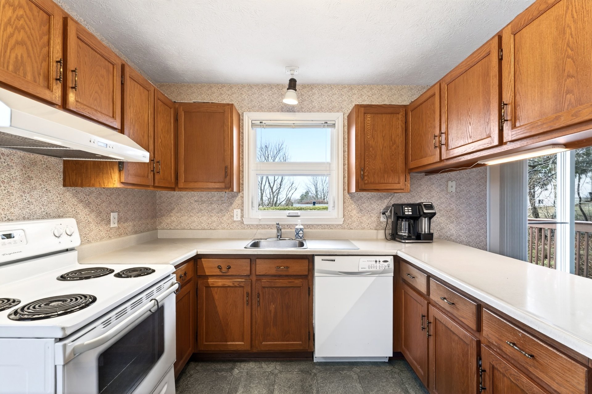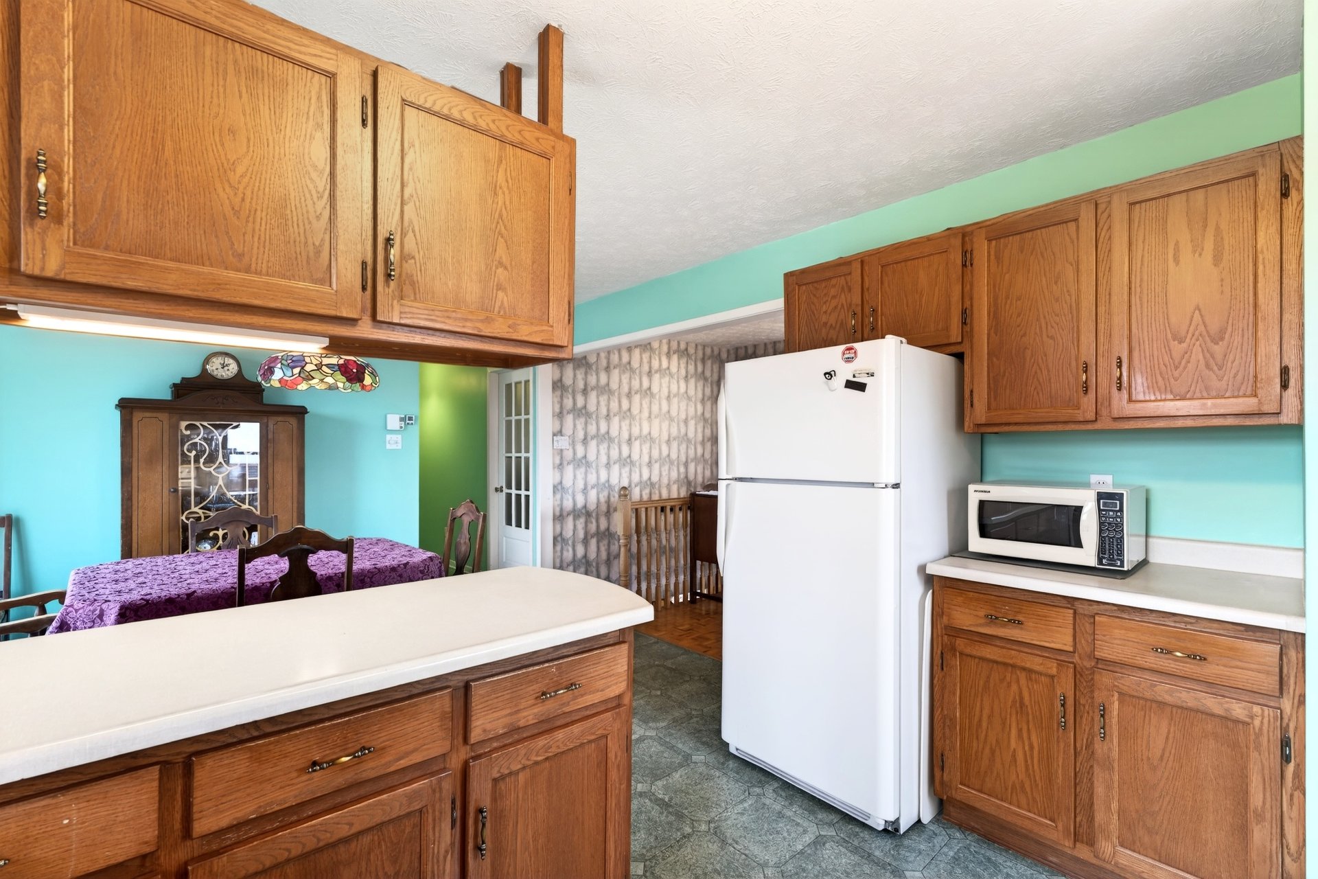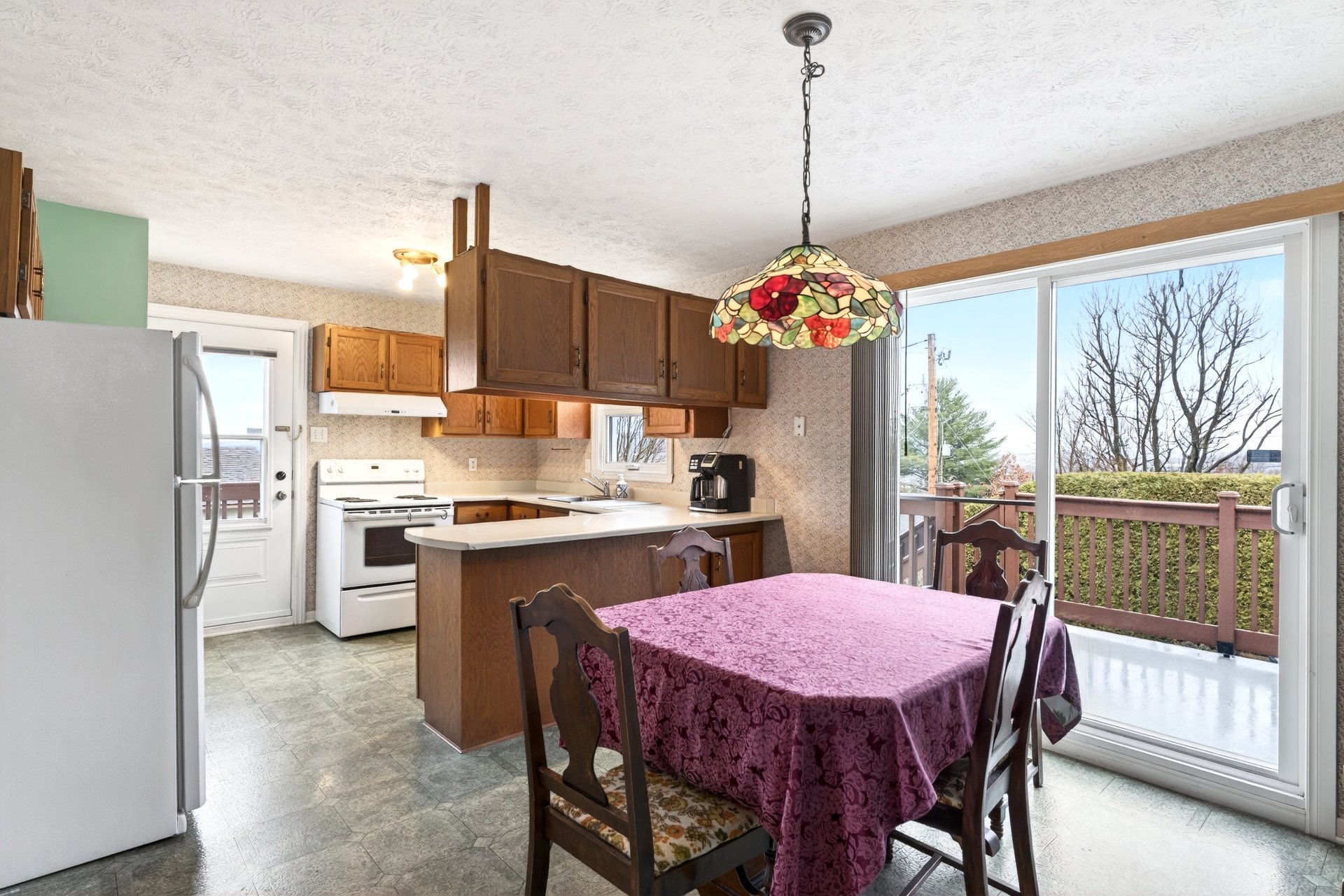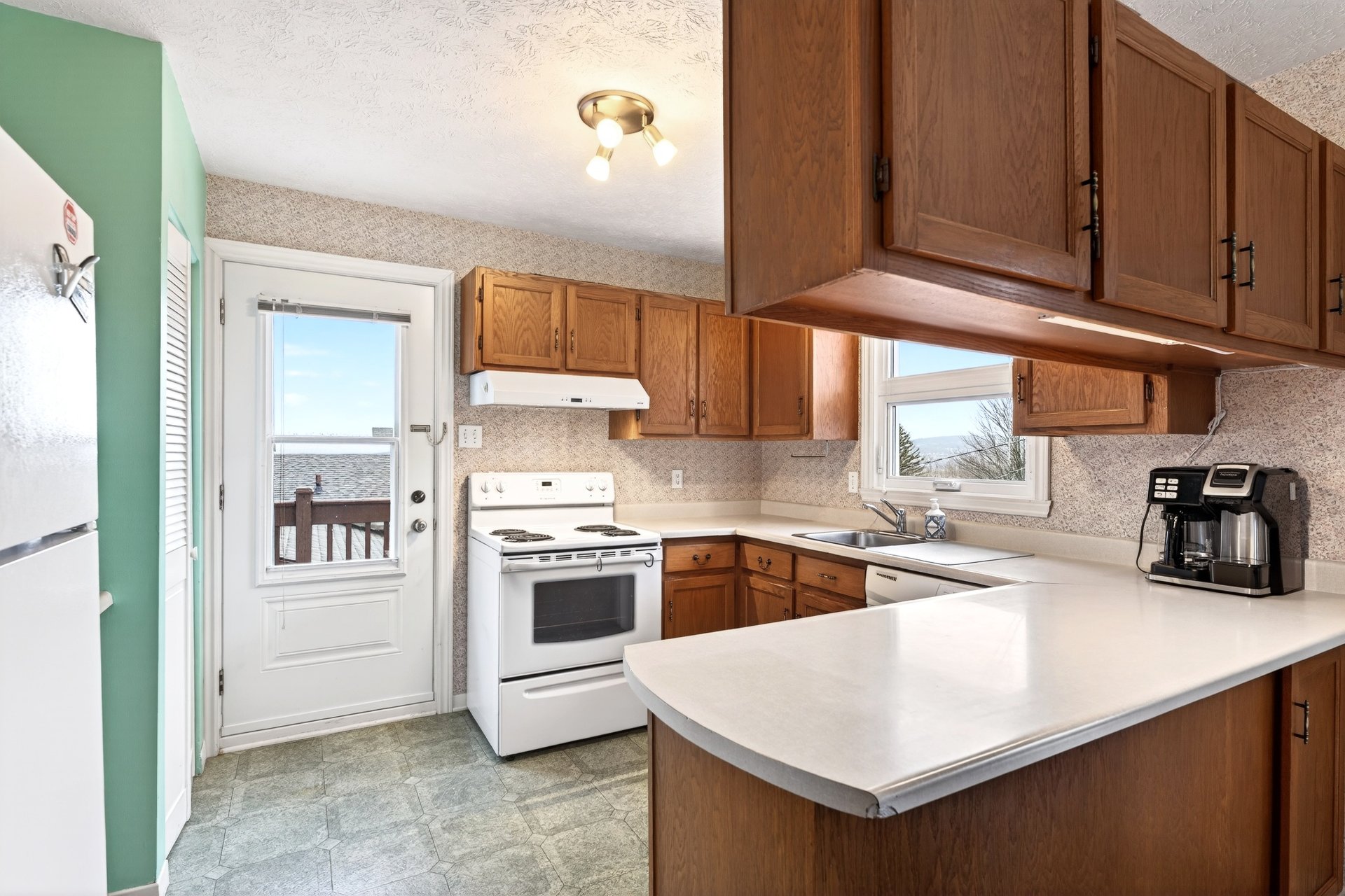 La cuisine munie d'armoires de bois dispose d'une porte