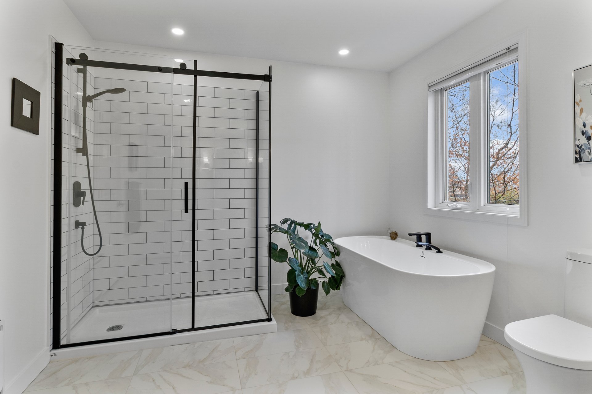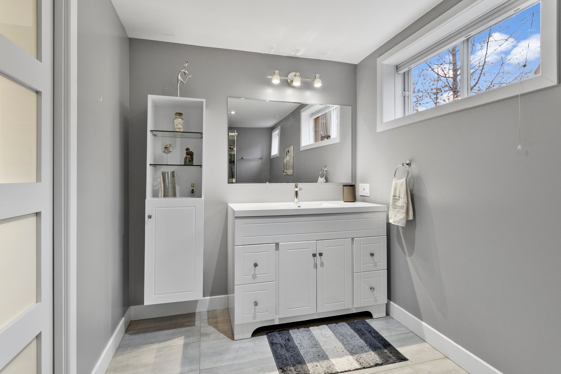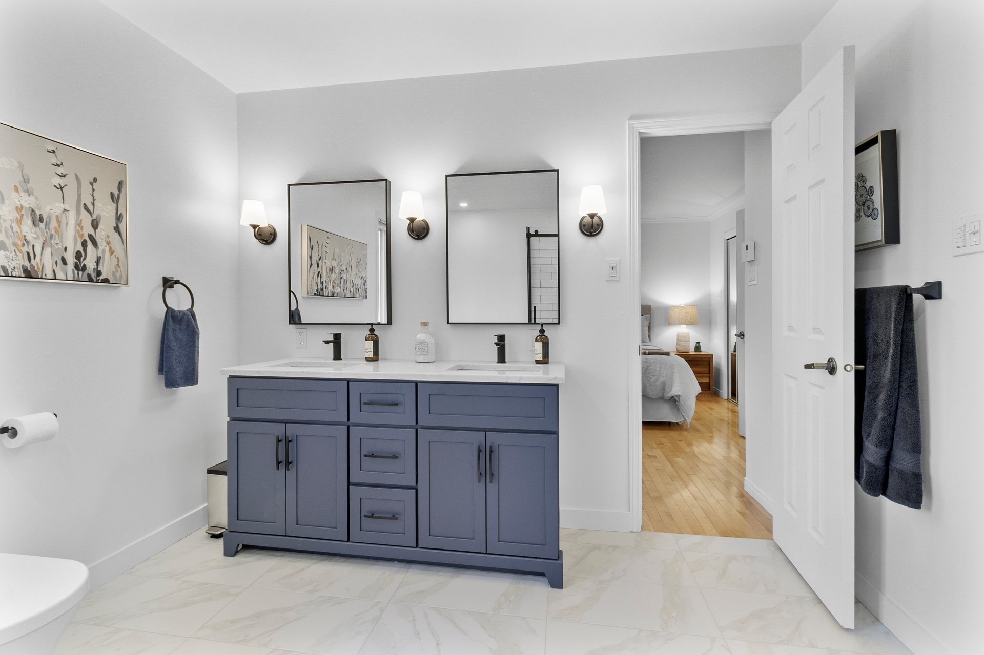À l'étage, vous trouverez trois chambres à coucher de bonnes dimensions, dont une chambre principale offrant un accès direct à une somptueuse salle de bains rénovée par une designer professionnelle. Celle-ci propose une douche en verre, un bain autoportant et un comptoir avec double lavabo, créant un véritable espace de détente digne d'un spa à domicile.