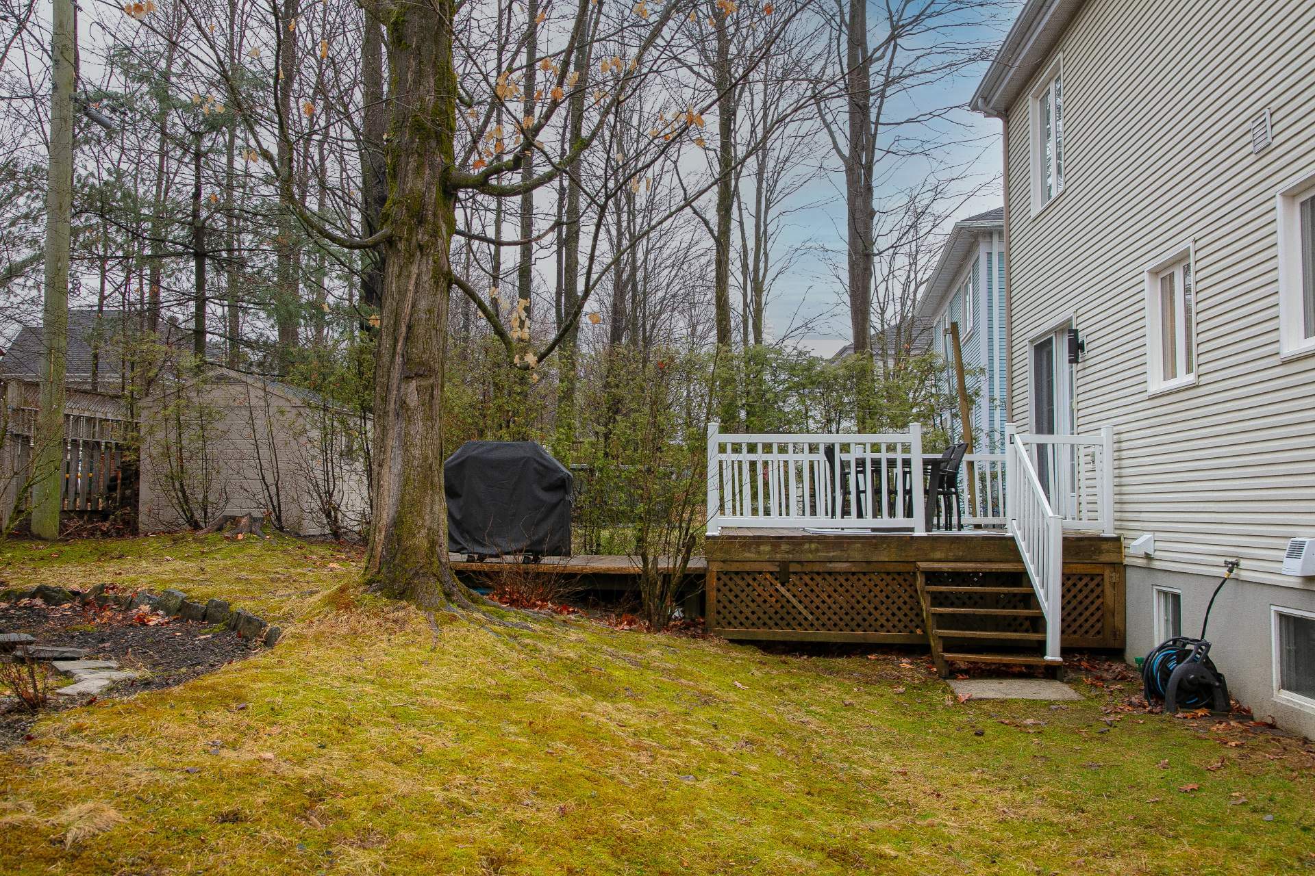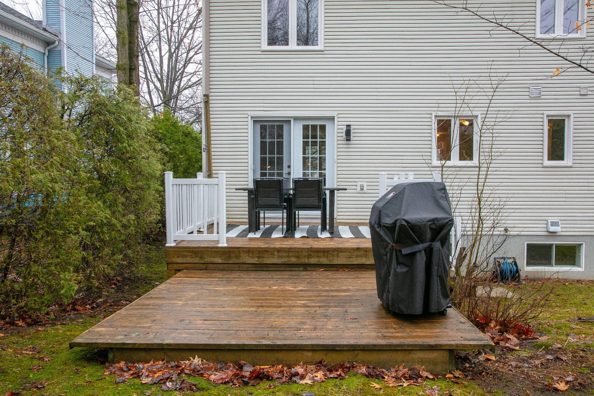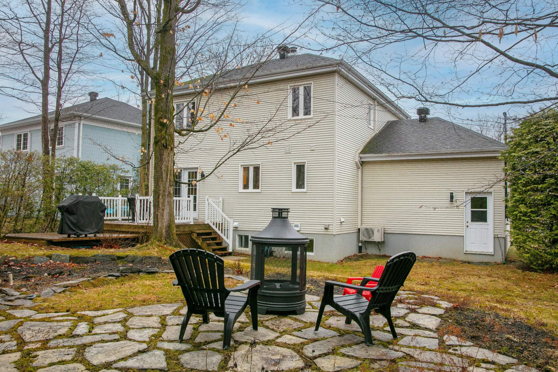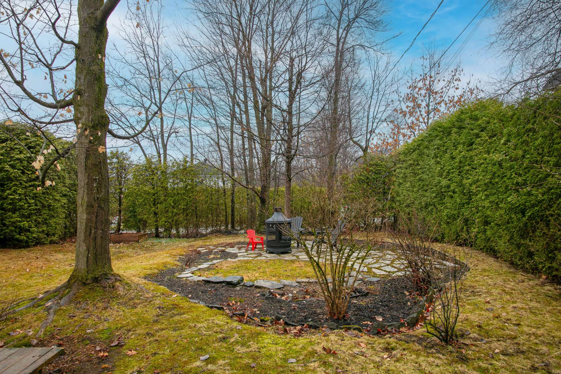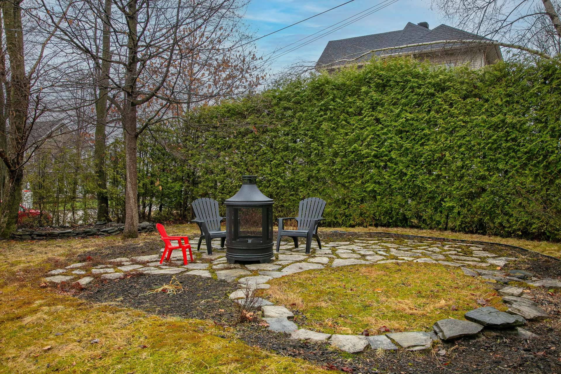 À l'extérieur, la cour arrière intime et verdoyante invite à la détente avec son aménagement paysager naturel et son espace détente, parfait pour profiter des soirées en plein air.