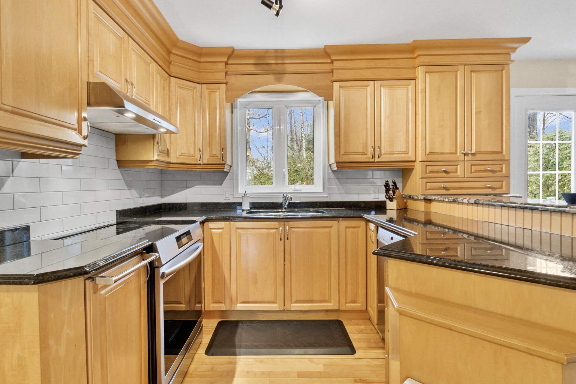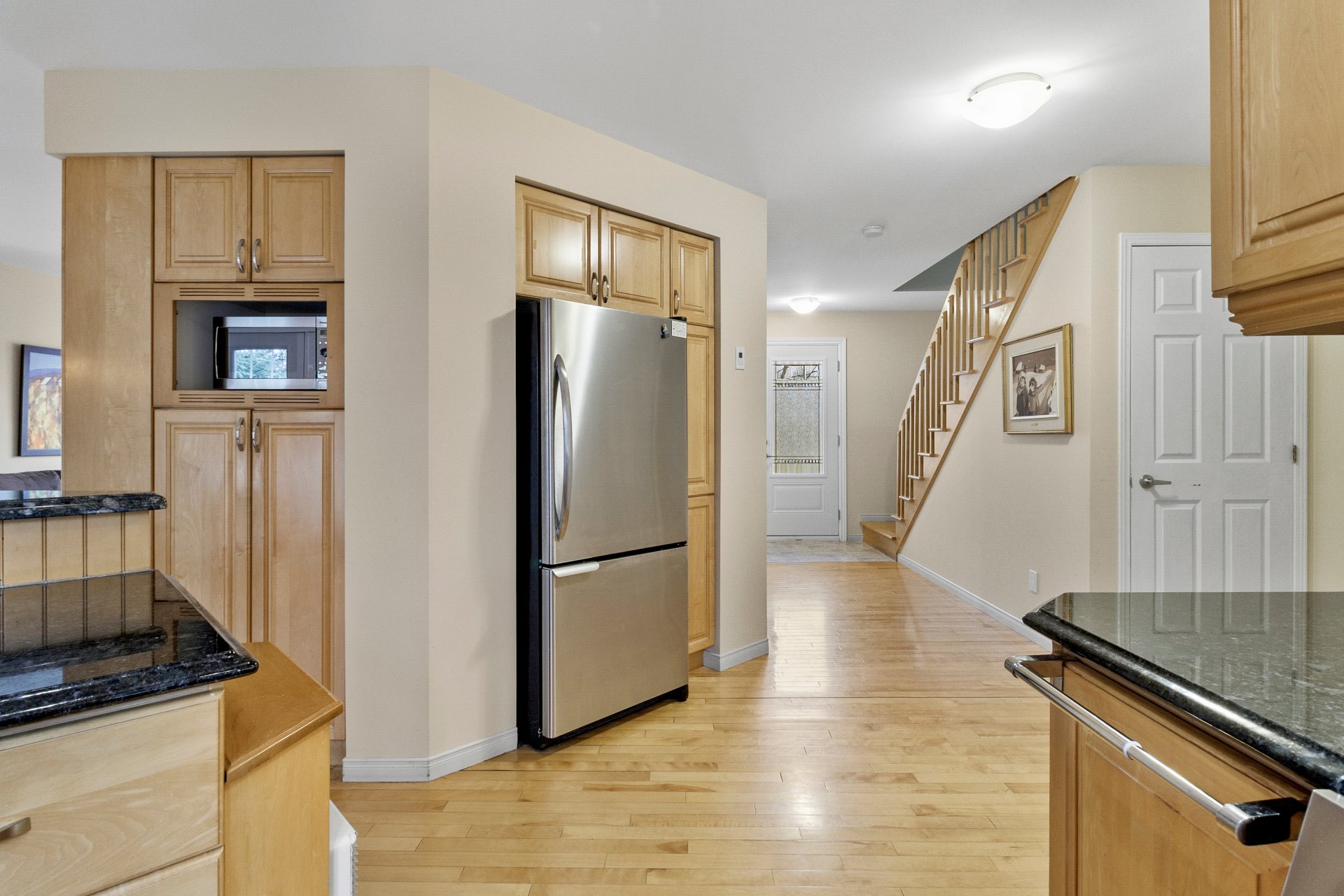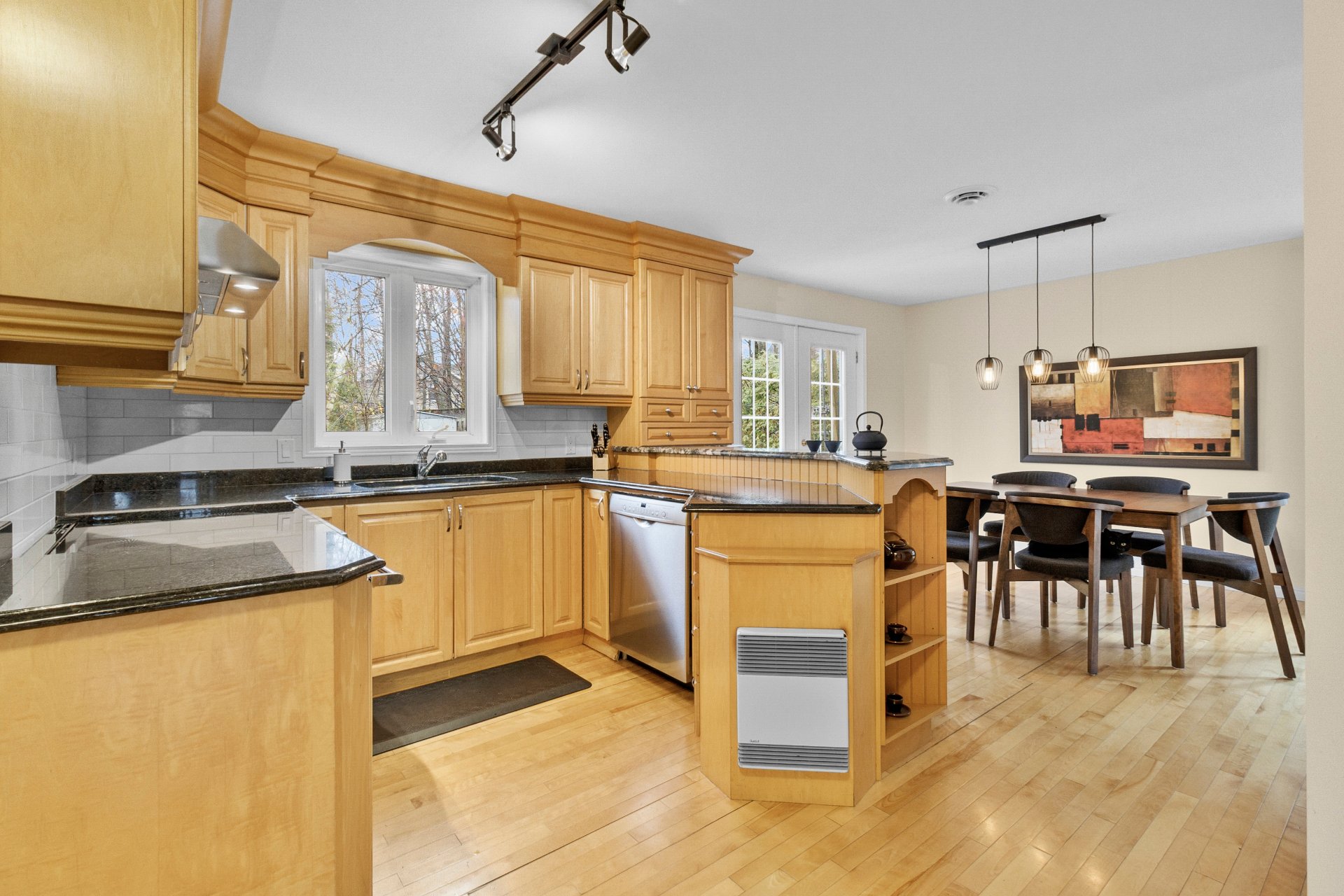 La cuisine, à la fois fonctionnelle et élégante, se démarque par ses armoires en bois, ses comptoirs de granit et son abondance de rangement. Son accès direct au garage ajoute un côté pratique au quotidien.