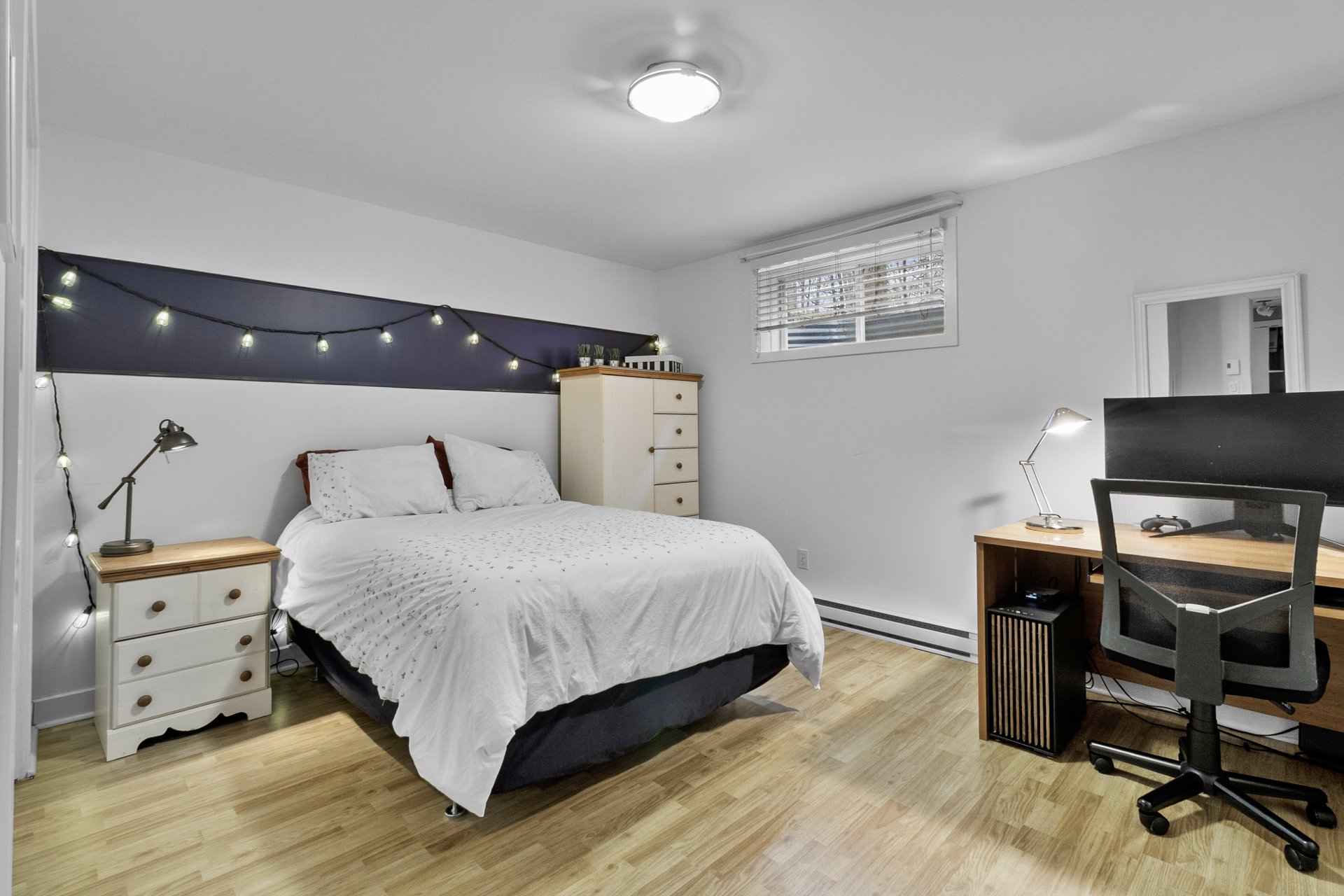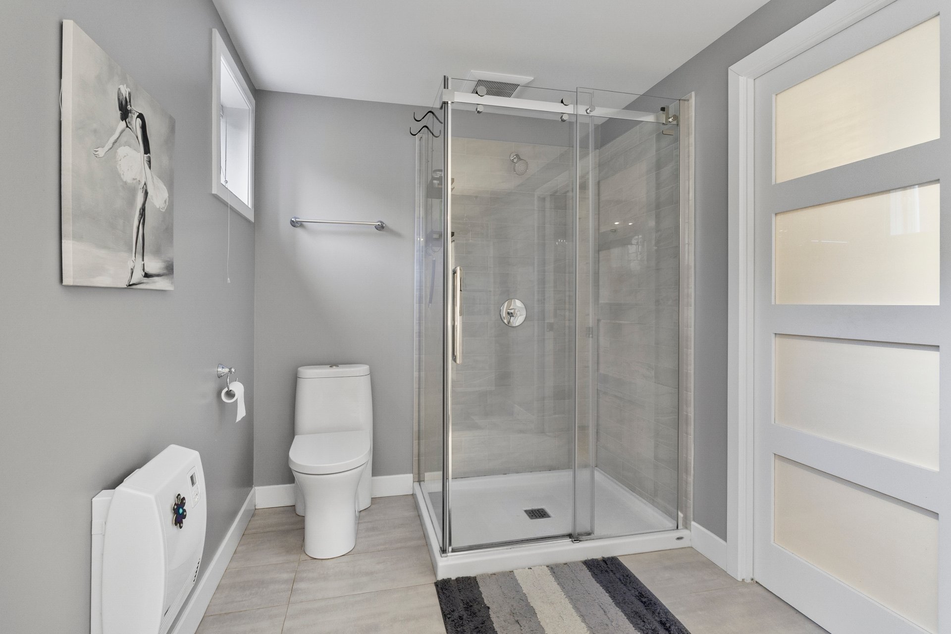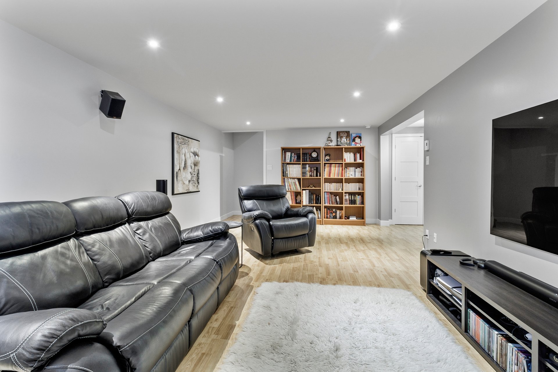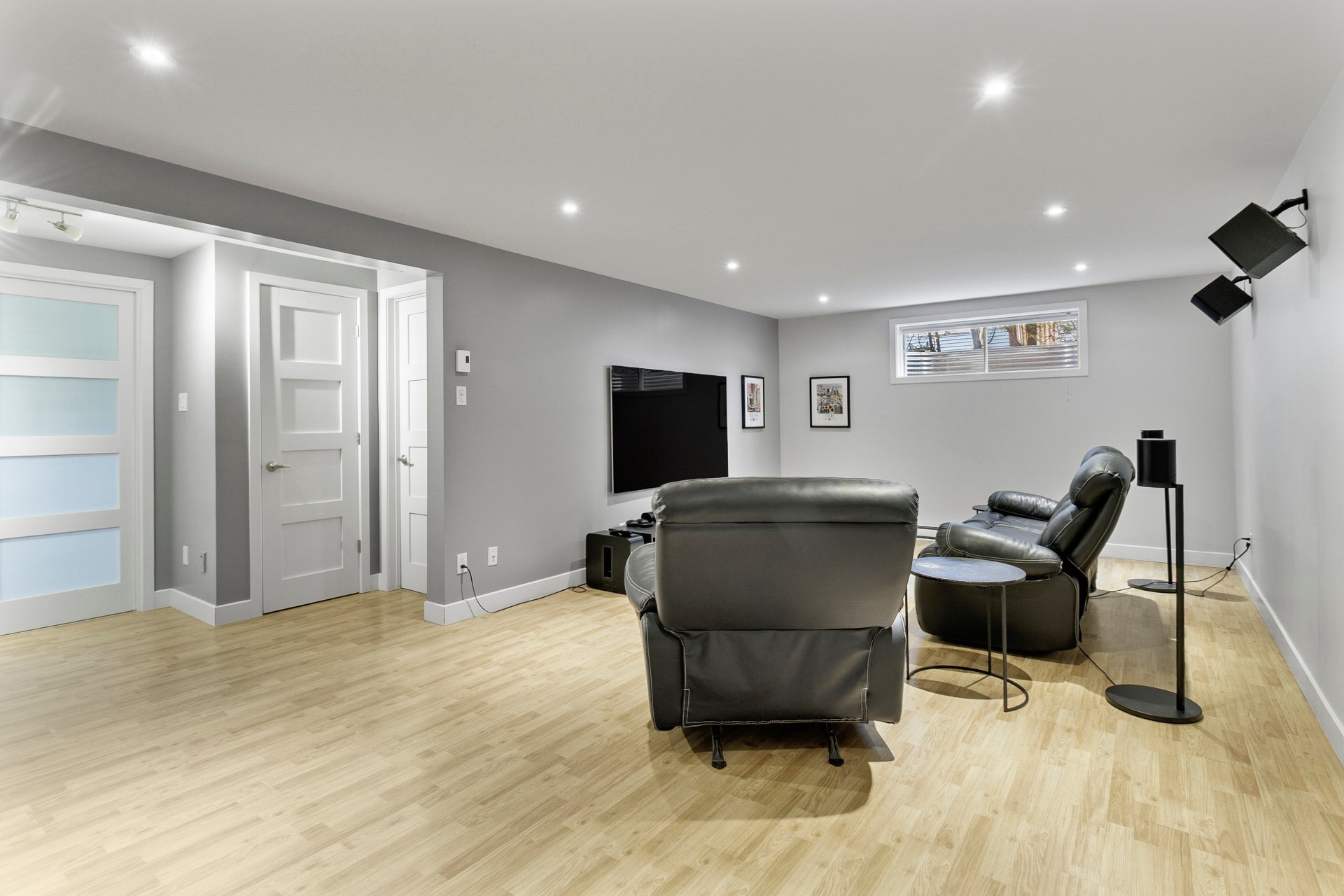 Le sous-sol entièrement aménagé offre une grande salle familiale polyvalente, parfaite pour les soirées cinéma ou un espace de jeux, en plus d'une quatrième chambre et d'une deuxième salle de bains moderne avec douche en verre, idéale pour accueillir famille et invités en toute intimité.