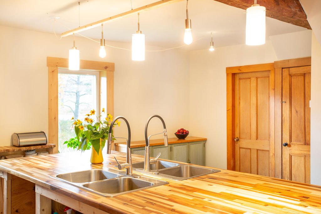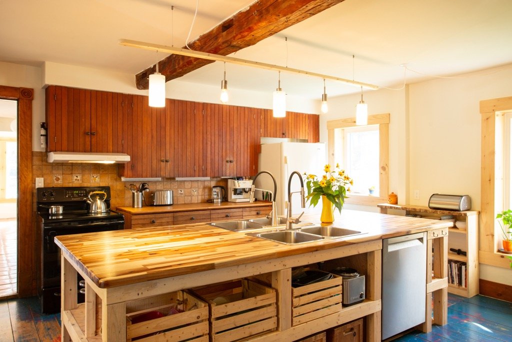 grand îlot central avec deux éviers, des armoires de bois